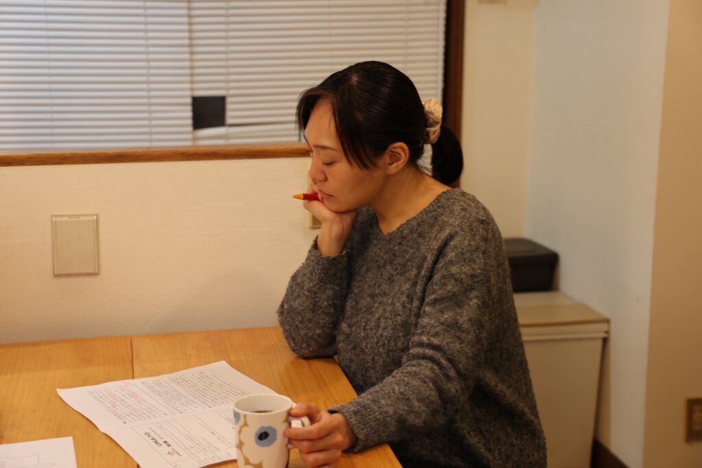俳優のみならずアクティングコーチとしても活動されているせいのさん。監督の演出意図を的確に表すせいのさんの言葉に、スタッフは何度も聞き入っていました。とくに家のシーンでは、シーンを的確な方向に導いてくださいました。